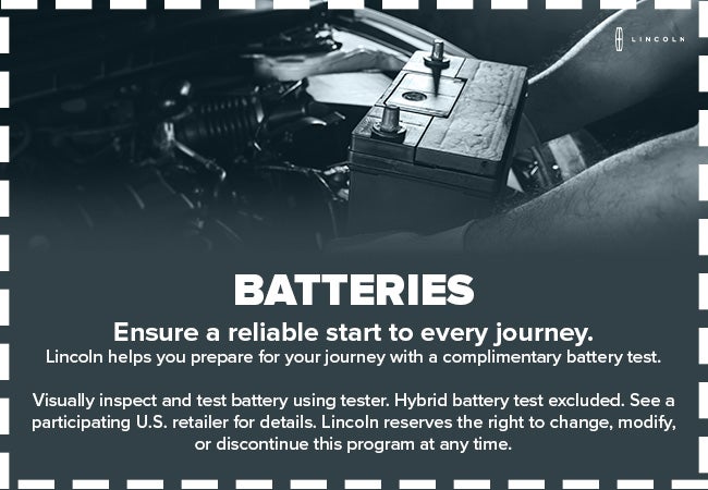 *Visually inspect and test battery using tester. Hybrid battery test excluded. See participating U.S. retailer for details. Lincoln reserves the right to change, modify, or discontinue this program at any time.