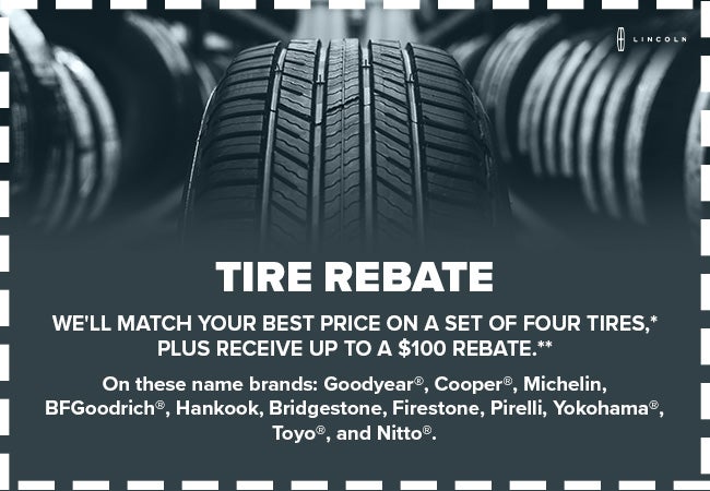 EXPIRES 04/30/26 Submit rebate online or by mail; rebate payment will be sent by mail. *Valid on retailer-installed retail or fleet eligible retail purchases only. Requires presentation of competitor's current price ad/offer on exact tire sold by retailer within 30 days after purchase. For online quotes, guarantee applies only to new tires sold on retailer websites. Excludes tires sold by third parties on marketplace sites and any resellers. See a participating U.S. retailer for details. Lincoln reserves the right to change, modify, or discontinue this program at any time. **Retailer-installed purchase only. Limit one (1) rebate offer per retail customer vehicle and limit of 15 vehicles per fleet eligible customer. $100 tire rebate or 22,000 Lincoln Access Rewards™ bonus Points on a set of four Goodyear®, Cooper®, Hankook, Bridgestone, Firestone, Pirelli, Yokohama®, Toyo®, and Nitto® tires. $50 tire rebate and $50 service allowance or 22,000 Lincoln Access Rewards bonus Points on Michelin and BFGoodrich® tires. Toyo medium/commercial truck and Motorsport patterns are excluded. Must have an activated Lincoln Access Rewards account within 60 days of qualifying activity to receive Lincoln Access Reward Points. Points are not redeemable for cash and have no monetary value. Point earning and redemption values are approximate and vary by products and services redeemed. See the Lincoln Access Rewards Program Terms at LincolnAccessRewards.com for information regarding expiration, redemption, forfeiture, and other limitations on Lincoln Access Rewards Points. Points will be awarded within eight weeks of rebate submission. Offer valid 4/1/26 to 4/30/26. Submit rebate by 5/31/26 online at Lincoln.com/service-rebates or by mail-in rebate form; rebate payment will be sent by mail. See a participating U.S. retailer for vehicle applications and offer details through 4/30/26.