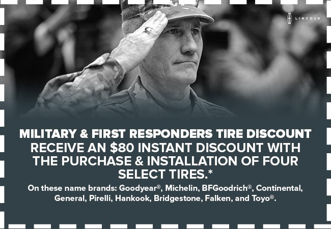 EXPIRES 12/31/26 *The Ford Military and First Responder Tire Discount Program is available to active and retired Military and First Responders who purchase and have installed a set of four (4) qualifying tires. Qualifying customers are eligible to receive a discount of $80 off participating brands at the time of installation. Participating brands are: Goodyear®, Michelin, BFGoodrich®, Continental, General, Pirelli, Hankook, Bridgestone, Falken, and Toyo®. Toyo medium/commercial truck and Motorsport patterns are excluded. This discount is in addition to any other eligible discount, rebate, or offer a dealer or tire manufacturer may already provide. Tires must be installed at a participating U.S. Ford Dealer, Lincoln Retailer, or Quick Lane® Store. Prior authorization is necessary before work is performed, and program-provided Hero Code must be presented at the time of purchase - ID.me account and validation are required. Hero Code is nontransferable and can only be used by the associated ID.me account holder. Additional details can be found here: Military and First Responders Tire Discount. Maximum of two Hero Codes per calendar year per customer can be generated/claimed. Offer valid for tires purchased and installed 1/1/25 - 12/31/26. Unused 2025 Hero Codes expire after 12/31/25. Unused 2026 Hero Codes expire after 12/31/26. Quick Lane® is a registered trademark of Ford Motor Company.